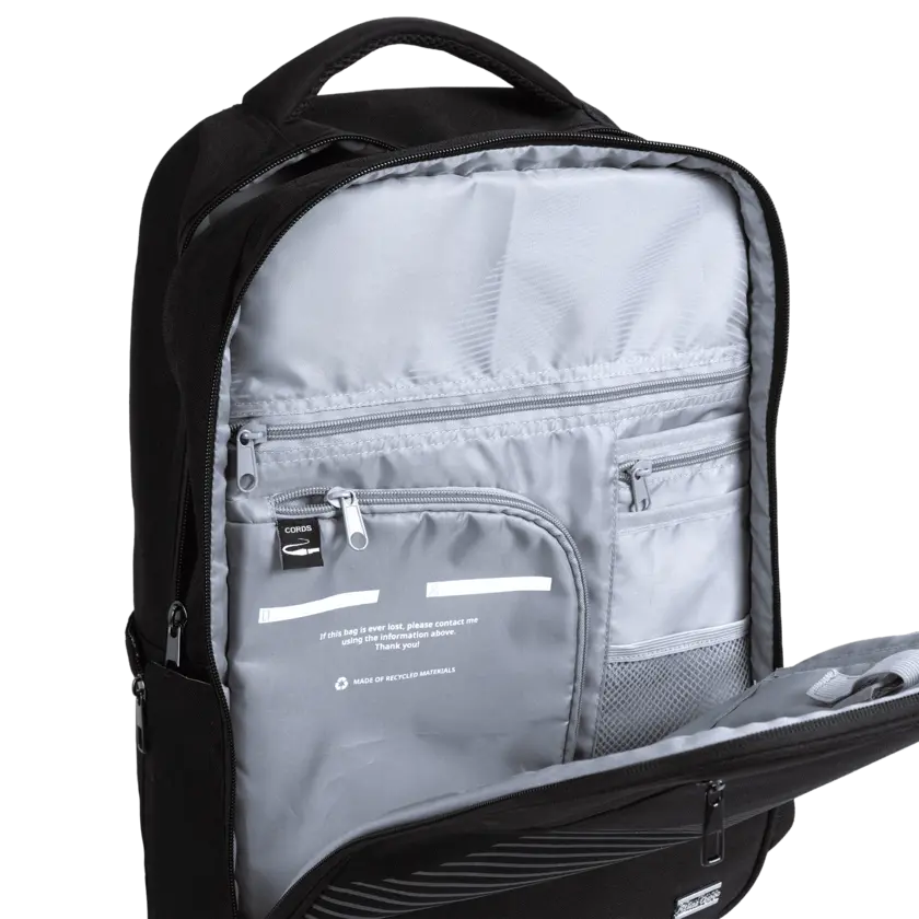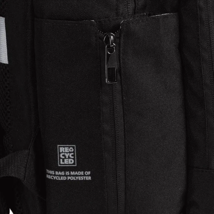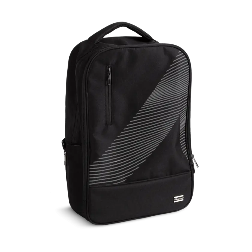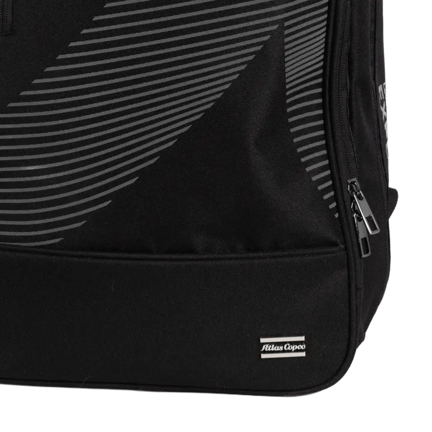 Durable backpack in recycled, water-resistant fabric with reversed zippers and reflective details. Features a padded laptop compartment and organized storage. Finished with a metallic 3D silver Atlas Copco logo - combining functionality, innovation, and a clean professional look.